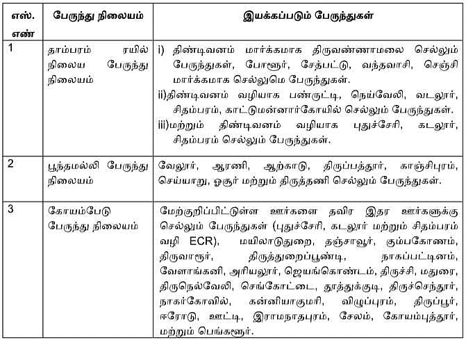 3) இதேபோல் கோயம்பேட்டிலிருந்து பிற மாவட்டங்களுக்கு இயக்கப்படும் ஆம்னி பேருந்துகள் பூந்தமல்லி உயர் சாலை, மதுரவாயல் புறவழிச்சாலை, மதுரவாயல் டோல் பிளாசா மற்றும் பெருங்குளத்தூர் வழியாக செல்ல வேண்டும்.
