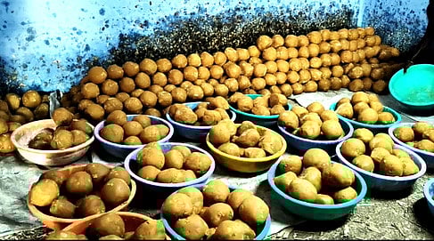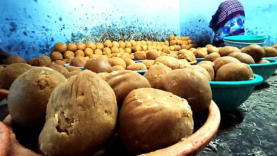 தயாா் செய்து குளிரவைக்கப்பட்டுள்ள அச்சு வெல்லம் மற்றும் உருண்டை வெல்லங்கள்.