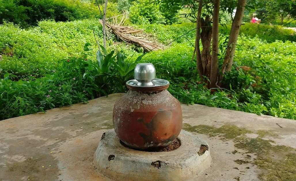 விவசாயி தங்கவேல் தனது நிலத்தில் வழிப்போக்கர்களுக்கான வைத்துள்ள தண்ணீர் பானை மற்றும் தரைமட்ட திட்டு.