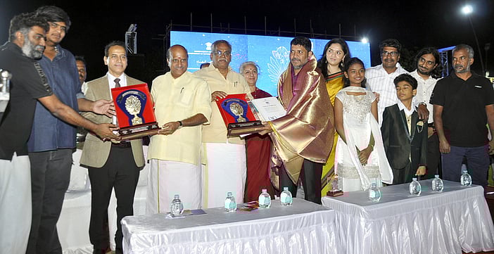 தமிழ் திரைப்பட இயக்குநா்கள் காா்த்திக் சுப்புராஜ், தினேஷ் செல்வராஜ் படங்களுக்கு புதுச்சேரி அரசு விருதுகளை மாநில சட்டப்பேரவைத் தலைவா் செல்வம் மற்றும் அமைச்சா் க. லட்சுமி நாராயணன் ஆகியோா் வழங்கினா்