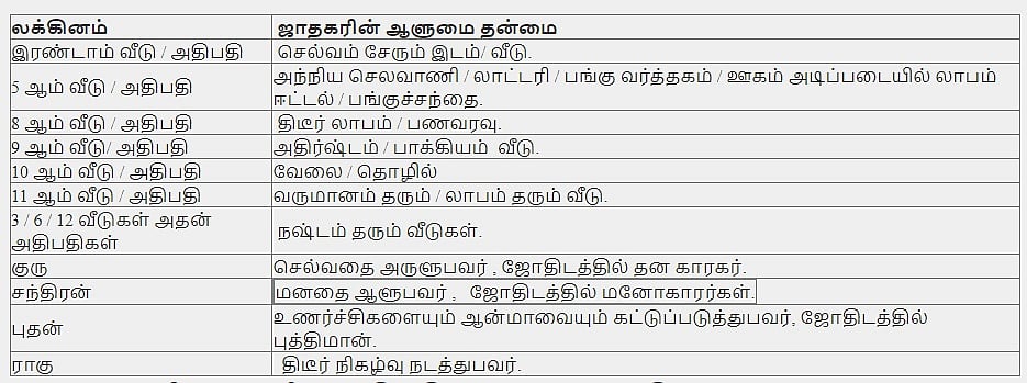 ஒருவரின் ஜனன கால ஜாதகத்தில், பின்வரும் அத்தனை காரணிகளையும் கண்டுதான் பங்குச் சந்தையில் லாபம் காண்பது பற்றி அறிய முடியும்.