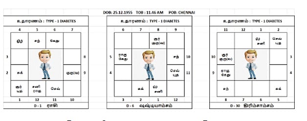 மேற்படி ஜாதகத்தில் கிரக இணைவுகள் படி ஜாதகருக்கு TYPE -1 நீரிழிவு நோயால் பாதிப்படைவார் எனக் கணிக்கப்பட்டது. அது போல் ஜாதகர் தற்போது நீரிழிவு நோய்க்கான மருத்துவச் சிகிச்சையில் உள்ளார்.