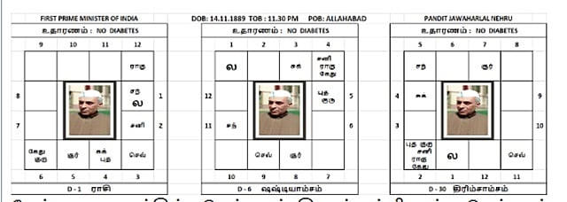 இதன்படி பார்த்தால் ஜவஹர்லால் நேரு ஜாதகத்தில் நீரிழிவு நோய் வராது / இல்லை எனக் கூறலாம் ஆனால் நீரிழிவு நோய்க்கும் இவரின் ஜாதகத்திற்கும் ஒரு ஒற்றுமை உள்ளது அது தான் "உலக நீரிழிவு நோய் தினம்" இவரின் பிறந்த தேதி ஆன 14 நவம்பர் தான் உலகெங்கிலும் நீரழிவு நோய் தினமாகக் கடைப்பிடிக்கப்படுகிறது.