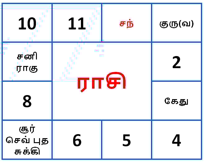 ராசியில் குரு(வ) - தைரிய வீர்ய ஸ்தானத்தில் கேது - களத்திர ஸ்தானத்தில் சூரியன், செவ்வாய், புதன், சுக்கிரன் - பாக்கிய ஸ்தானத்தில் சனி, ராகு - அயன சயன போக ஸ்தானத்தில் சந்திரன் என வலம் வருகிறார்கள் (வாக்கியப் பஞ்சாங்கப்படி).