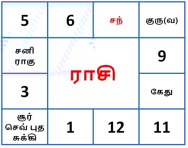 தன வாக்கு குடும்ப ஸ்தானத்தில் சூரியன், செவ்வாய், புதன், சுக்கிரன் - சுக ஸ்தானத்தில் சனி, ராகு - களத்திர ஸ்தானத்தில் சந்திரன் - அஷ்டம ஸ்தானத்தில் குரு(வ) - தொழில் ஸ்தானத்தில் கேது என வலம் வருகிறார்கள் (வாக்கியப் பஞ்சாங்கப்படி).