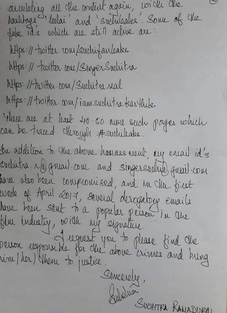எனது ட்விட்டர் கணக்கில் புகைப்படங்கள் வெளியானதற்கும் எனக்கும் சம்பந்தம் இல்லை. என் ட்விட்டர் கணக்கை ஹேக் செய்தவர்கள் மீது நடவடிக்கை எடுக்கவேண்டும். ஏப்ரல் மாதத்தில், எனது மின்னஞ்சலையும் ஹேக் செய்து அதிலிருந்து என் கையெழுத்துடன் சினிமா பிரபலத்துக்கு மின்னஞ்சல்கள் அனுப்பப்பட்டுள்ளன. எனவே இதுபோன்ற செயல்களில் ஈடுபட்டவர்கள் மீது நடவடிக்கை எடுக்கவேண்டும் என்று அவர் மனு அளித்துள்ளார். இந்தப் புகார் மனு சமூகவலைத்தளங்களில் வெளியாகியுள்ளன.