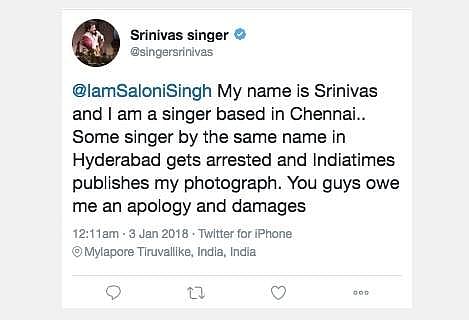 ஊடக அலட்சியத்தால் தனது புகைப்படம் தவறுதலாகப் பயன்படுத்தப் பட்டதற்கு பாடகர் ஸ்ரீனிவாஸ் கண்டனம்
