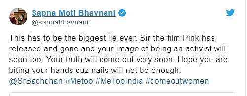 இதனைத் தொடர்ந்து கடந்த வெள்ளிக்கிழமை, புகழ் பெற்ற ஹேர் ஸ்டைலிஸ்ட் ஸப்னா மோடி பவ்னானி என்பவர், தனது ட்விட்டரில் பாலிவுட் மெகா ஸ்டார் அமிதாப் பச்சனை நேரடியாகத் தாக்கியுள்ளார். பிங்க் திரைப்படம் உள்ளிட்டு தனது பிறந்த நாளன்று எடுக்கப்பட்ட நேர்காணல் ஒன்றுக்கு நன்றி தெரிவித்த அமிதாப் பச்சன் ட்விட்டரில் பதிவிட்டிருந்த போது, அதற்கு பதிலாக ஸப்னா, ‘இது சுத்தப் பொய். உங்கள் படமான பிங்க் வெளியாகி நல்ல பெயரை உங்களுக்கு பெற்றுத் தந்திருக்கலாம், ஆனால் உங்கள் நல்ல பெயர் விரைவில் காலாவதியாகப் போகிறது. உங்கள் சுயரூபம் நிச்சயம் விரைவில் வெளிவரும். உண்மை நிச்சயம் வெளியில் வரத் தான் செய்யும். இப்போது நீங்கள் உங்கள் கையை கடிக்கத் தொடங்கி இருப்பீர்கள், என நம்புகிறேன், காரணம் கடிப்பதற்கு உங்கள் நகங்கள் போதாது’ என்று மீடூ ஹாஷ்டேக்குடன் ‘கம் அவுட் வுமன்’ என்று மற்ற பெண்களுக்கு அழைப்பும் விடுத்து பதிவிட்டிருந்தார் ஸப்னா.