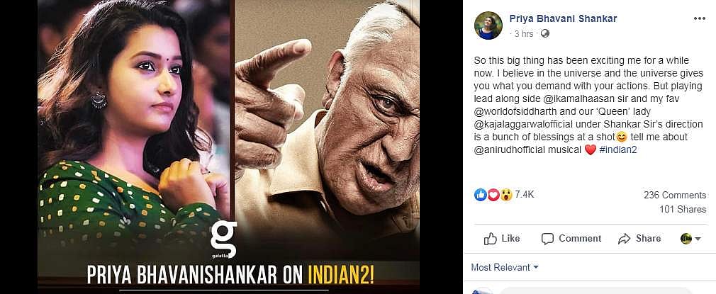 இந்நிலையில் நடிகை பிரியா பவானி சங்கர், இந்தியன் 2 படத்தில் நடிக்க ஒப்பந்தமான மகிழ்ச்சியை தனது முகநூலில் பகிர்ந்துள்ளார். அதில் அவர் கூறியிருப்பது, 'இந்த பெரிய சந்தோஷமான விஷயம் இப்போது சிறிது காலமாக என்னை உற்சாகப்படுத்தி வருகிறது. நான் பிரபஞ்சத்தை நம்புகிறேன், உங்கள் செயல்கள் மூலம் நீங்கள் கேட்பதை எல்லாம் பிரபஞ்சம் உங்களுக்குத் தருகிறது. ஆனால் கமல் சாருடனும், எனக்குப் பிடித்த நடிகரான சித்தார்த் உடனும், க்வீன் படத்தில் நடக்கும் அரசி காஜல் அகர்வாலுடனும் நடிப்பேன் என்று நிச்சயமாக நினைக்கவில்லை. அதிலும் ஷங்கர் சாரின் இயக்கம் என்றால் அது மிகப் பெரிய ஆசிர்வாதம். அனிருத் இசை பற்றி கூடுதலாக சொல்லவும் வேண்டுமா? ஒரே நேரத்தில் அல்லா ஆசிகளும் எனக்குக் கிடைத்துவிட்டதைப் போல உணர்கிறேன்.' என்று பிரியா பதிவிட்டிருந்தார்.