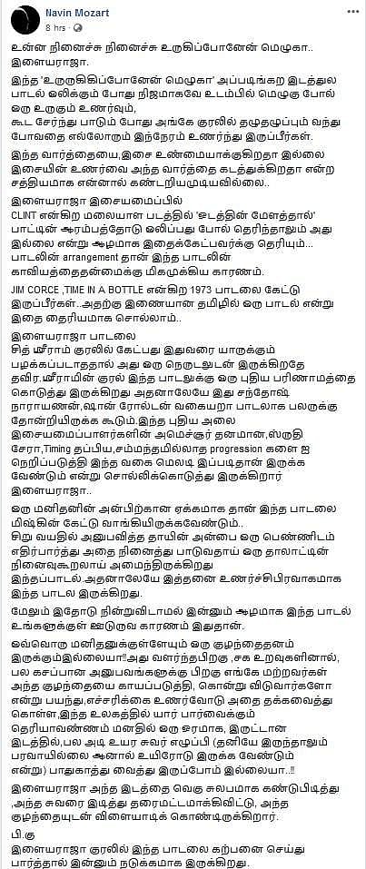 இளையராஜா இசையமைப்பில் சித் ஸ்ரீராம் பாடிய உன்னை நினைச்சு நினைச்சு பாடல் நேற்று வெளியானது. இந்தப் பாடலுக்கு ரசிகர்கள் அமோக ஆதரவு அளித்துள்ளார்கள். இளையராஜா + சித் ஸ்ரீராம் கூட்டணி மிகவும் புதுமையாக உள்ளதாகப் பலரும் கருத்து தெரிவித்துள்ளார்கள். இப்பாடல் குறித்துச் சமூகவலைத்தளங்களில் ரசிகர்கள் எழுதிய பதிவுகளின் தொகுப்பு: