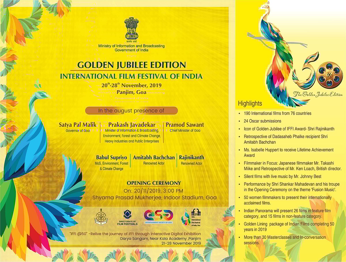 இந்தியாவில் ஒவ்வொரு ஆண்டும் சா்வதேச திரைப்பட விழா கொண்டாடப்பட்டு வருகிறது. இந்த ஆண்டு 50-ஆவது சா்வதேச திரைப்பட விழா கோவாவில் இன்று முதல் 28-ம் தேதி வரை 9 நாள்கள் மிக பிரம்மாண்டமாக நடைபெற உள்ளது. மத்திய சுற்றுச்சூழல், வனம், பருவநிலை மாற்றம், தகவல் ஒலிபரப்புத் துறைகளின் அமைச்சர் பிரகாஷ் ஜாவடேகர், ரஜினி, அமிதாப் பச்சன் உள்ளிட்ட பிரபலங்கள் கோவா திரைப்பட விழாவை இன்று தொடங்கி வைத்தார்கள்.