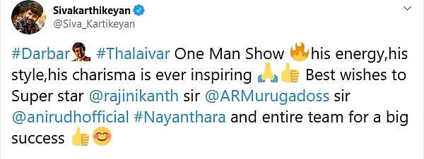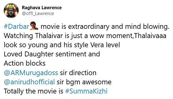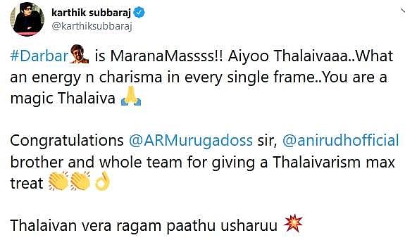 இன்று வெளியாகியுள்ள தர்பார் படத்துக்கு இருவிதமான விமரிசனங்கள் வந்துள்ளன. இந்நிலையில் படத்தைப் பார்த்த திரையுலகப் பிரபலங்கள் ட்விட்டரில் பாராட்டி எழுதியதாவது:
