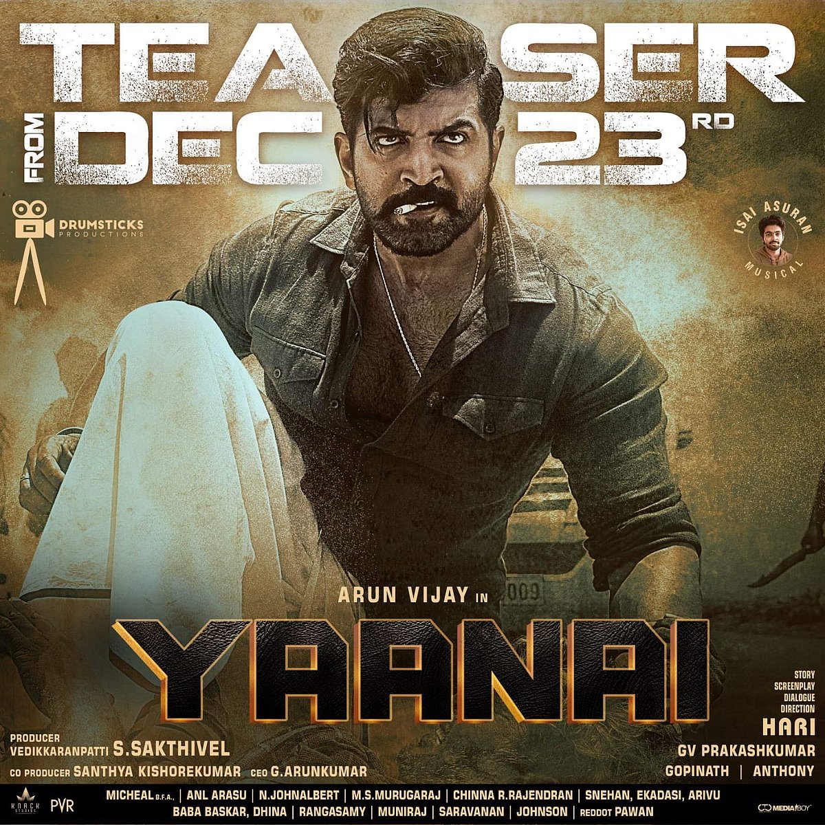இயக்குநர் ஹரி இயக்கத்தில் உருவாகியிருக்கும் யானை படத்தின் டீசர் வருகிற 23 ஆம் தேதி வெளியாகும் என்று அறிவிக்கப்பட்டுள்ளது.