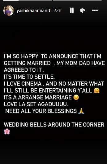 இந்த நிலையில் அவர் தனது இன்ஸ்டாகிராம் பக்கத்தில், எனக்கு விரைவில் திருமணம் நடக்கவிருக்கிறது. இதனை மகிழ்ச்சியாக அறிவிக்கிறேன். எனது அம்மாவும் அப்பாவும் திருமணத்துக்கு சம்மதம் தெரிவித்துவிட்டனர். திருமணம் செய்வதற்கு இது சரியான தருணம். நான் சினிமாவை நேசிக்கிறேன். அதனால் நான் உங்களைத் தொடர்ந்து மகிழ்விப்பேன்.