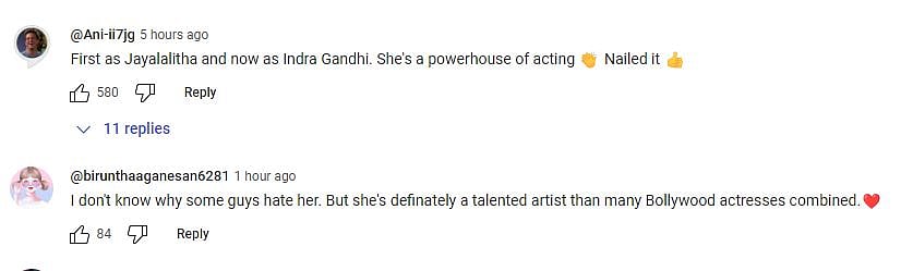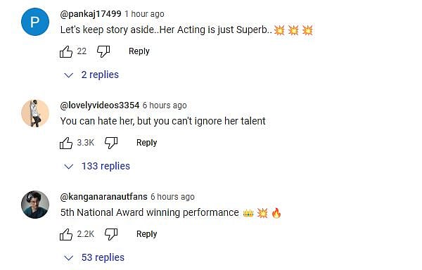 ரசிகர்கள் யூடியூப்பில் கங்கானாவுக்கு ஆதரவு தெரிவித்து வருகிறார்கள். “ நீங்கள் கங்கனா ரணாவத்தை வெறுக்கலாம் ஆனால் அவரது திறமையை மறுக்க முடியாது. 5 ஆவது தேசிய விருதுக்கு தயார்” என பலரும் நேர்மறையான (பாசிட்டிவ்) கருத்துகளை தெரிவித்து வருகின்றனர்.