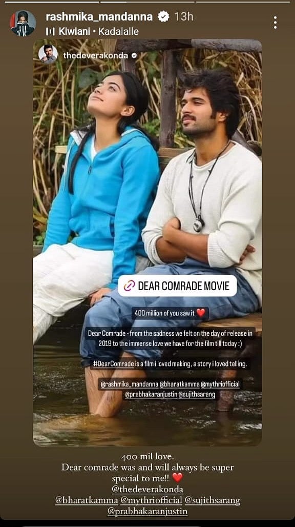 ராஷ்மிகா இதனைப் பகிர்ந்து , “400 மில்லியன் லவ். டியர் காம்ரேட் எப்போதும் எனக்கு சிறப்பான படம்” எனப் பதிவிட்டுள்ளார்.