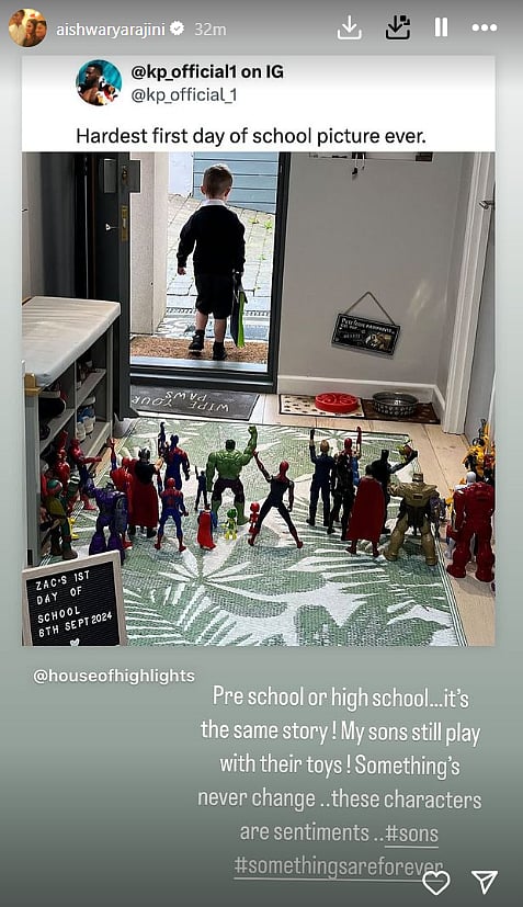 அதைப் பகிர்ந்த ஐஸ்வர்யா ரஜினிகாந்த், ”மழலையர் பள்ளியோ... உயர்நிலை பள்ளியோ... இதே கதைதான். என் மகன்கள் இப்போதும் பொம்மைகளுடன் விளையாடுகின்றனர். சில விஷயங்கள் மாறுவதேயில்லை. இந்தக் கதாபாத்திரங்கள் உணர்ச்சிப்பூர்வமானவை..” எனப் பதிவிட்டுள்ளார்.