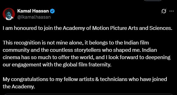 ஆஸ்கர் குழுவில் இணைந்த கமல் ஹாசன் அதற்காக பதிவொன்றை வெளியிட்டுள்ளார்.