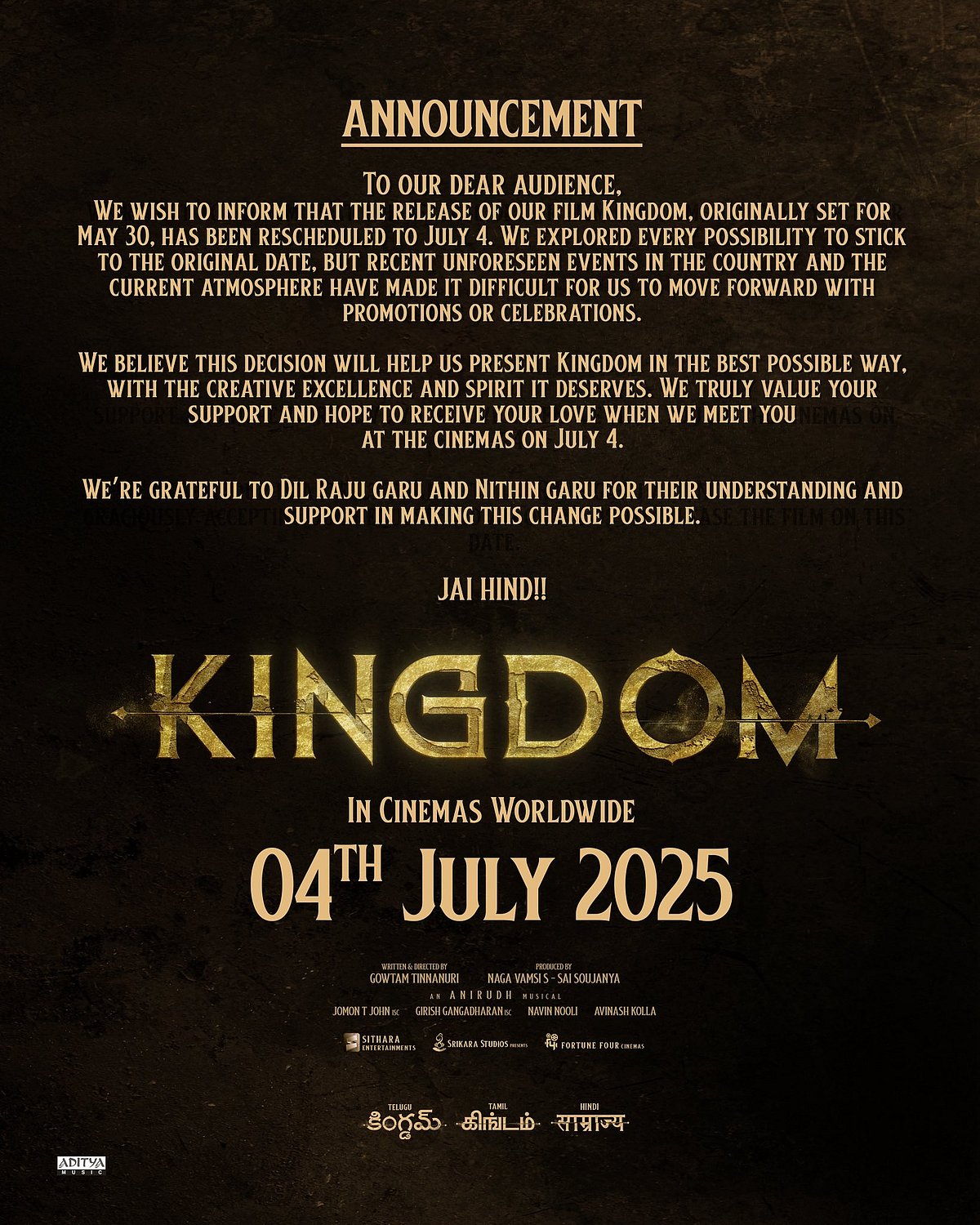சில மாதங்களுக்கு முன் படத்தின் டீசர் வெளியாகி கவனம் பெற்றதுடன் இப்படம் மே 30 ஆம் தேதி திரைக்கு வரும் என அறிவித்திருந்தனர். ஆனால், தற்போது கிங்டம் வருகிற ஜூலை 4 அன்று திரையரங்குகளில் வெளியாகும் எனத் தெரிவித்துள்ளனர்.