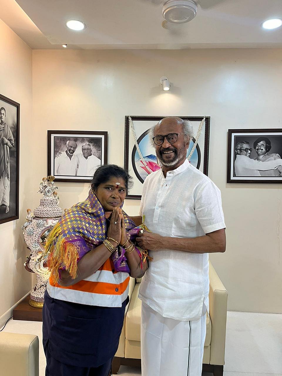 actor rajinikanth gift a gold chain to Sanitation worker padma.