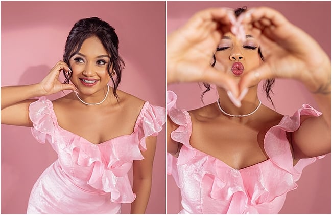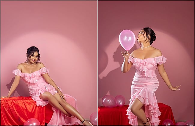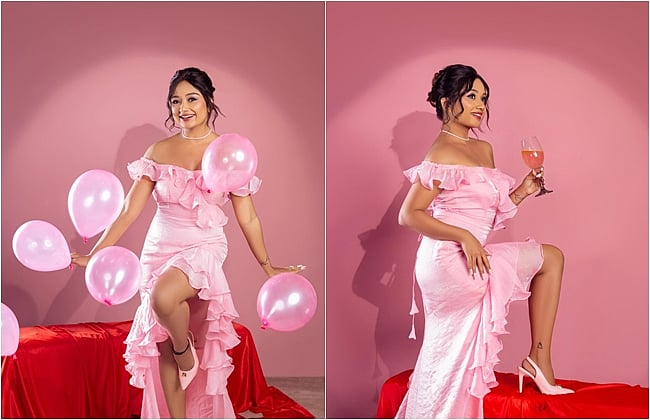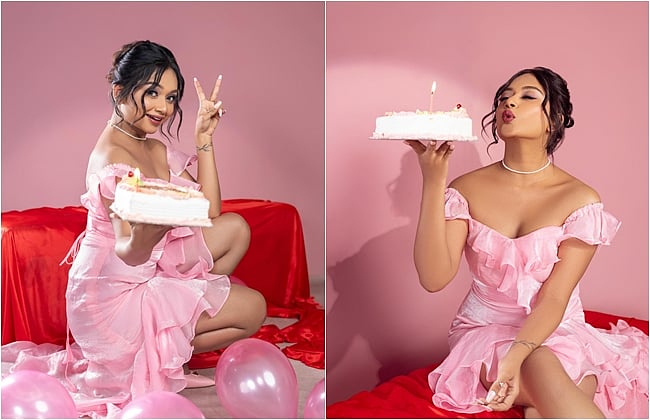 தனக்கு மிகவும் பிடித்த இளஞ்சிவப்பு நிற உடை அணிந்து, அதற்கு ஏற்ப பலூர், கேக், அரங்கம் என அனைத்தையும் ஒரே வண்ணத்தில் அலங்கரித்து புகைப்படங்களை எடுத்துள்ளார்.