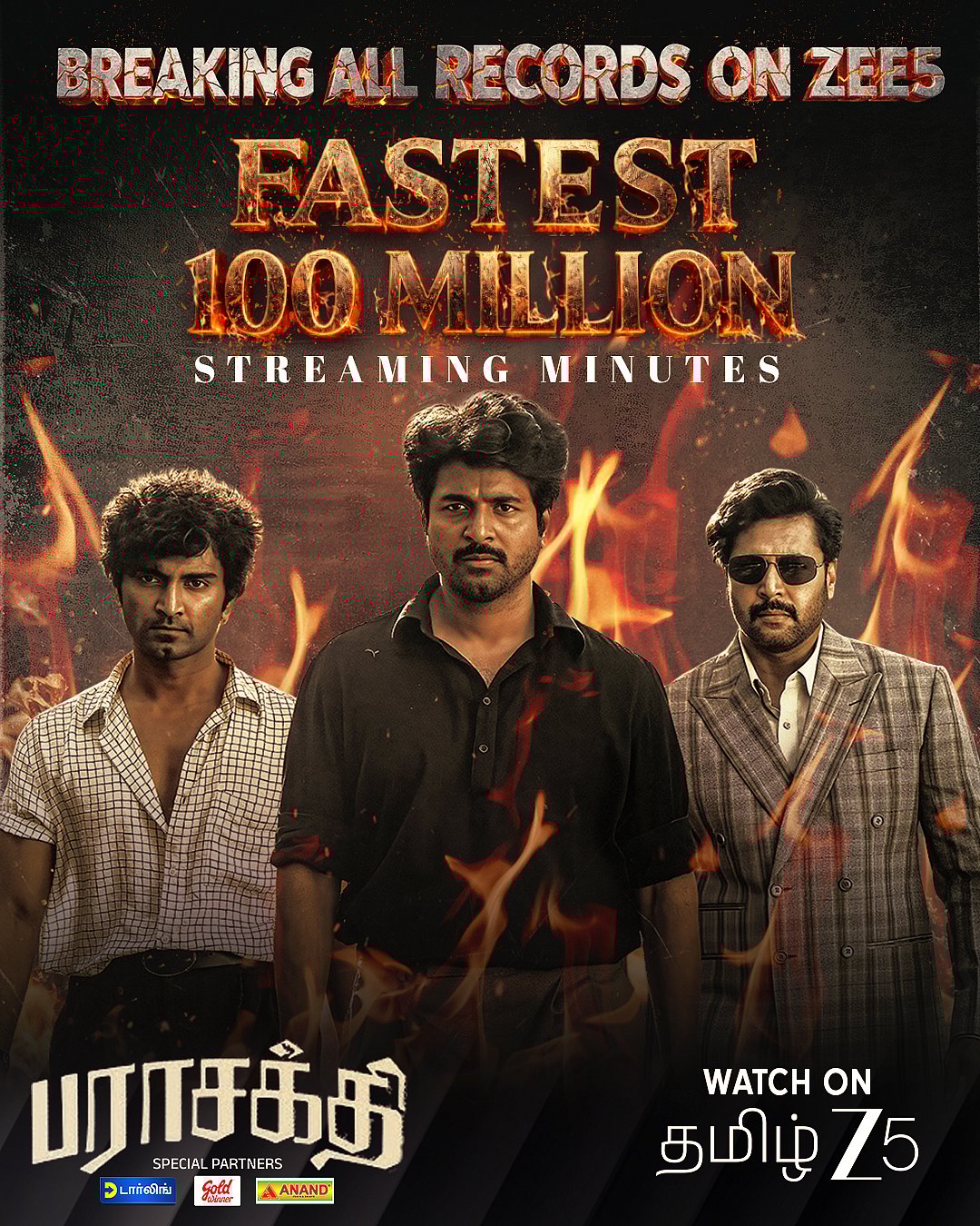 இந்த நிலையில், பராசக்தி படம் ஓடிடியில் வெளியாகி குறைந்த நேரத்திலேயே 1 கோடி நிமிட பார்வைகளைக் கடந்து புதிய சாதனை படைத்துள்ளதாக ஜீ5 ஓடிடி தளம் அதிகாரப்பூர்வமாக அறிவித்துள்ளது.