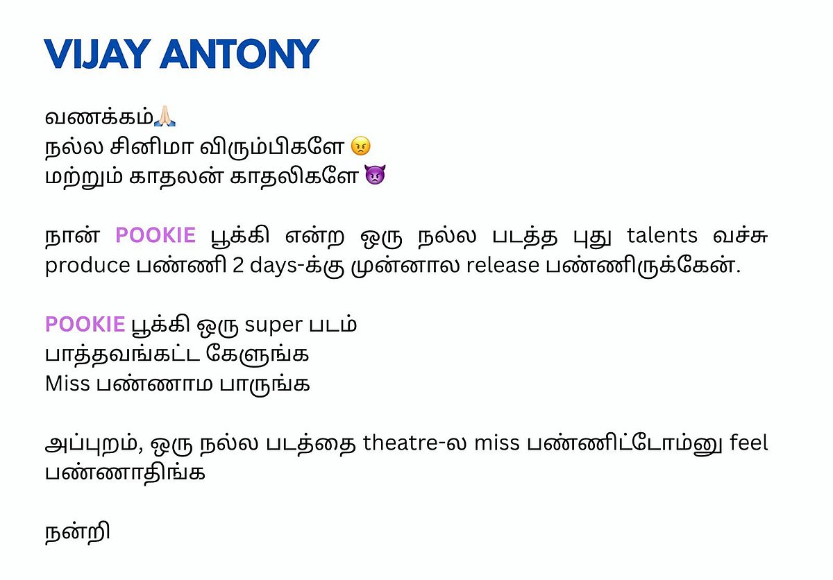 பூக்கி திரைப்படத்திற்காக விஜய் ஆண்டனி வேண்டுகோள் வைத்துள்ளார்.