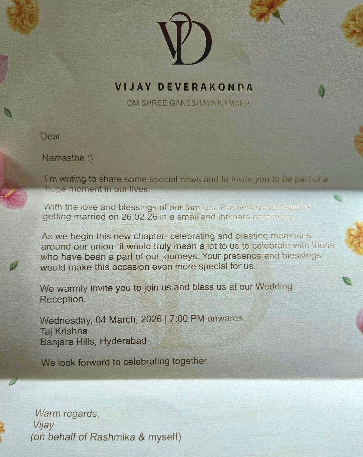 அந்தப் பத்திரிகையில், விஜய் தேவரகொண்டா மற்றும் ரஷ்மிகாவுக்கு பிப். 26 ஆம் தேதி திருமணமும் மார்ச் 4 ஆம் தேதி ஹைதராபாத்தில் உள்ள பஞ்சாரா ஹில்ஸுல் உள்ள தாஜ் கிருஷ்ணாவில் திருமணம் வரவேற்பு நிகழ்ச்சி நடைபெறும் என்றும் குறிப்பிடப்பட்டுள்ளது.