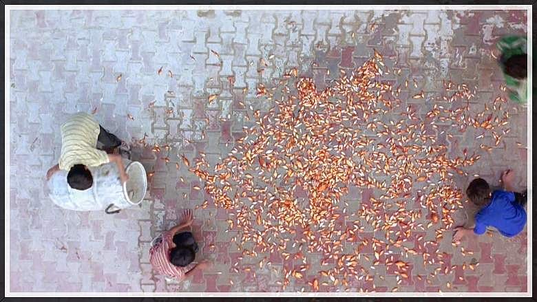 ஒருவழியாய் மீன் தொட்டியை வேனிலிருந்து கீழே இறக்குகையில் அதிலிருந்து தண்ணீர் பாதிக்கு மேல் கொட்டிப் போயிருந்தது. பக்கெட்டைப் பிடித்த படி ஓடி வருகையில் அது பாரம் தாங்காமல் உடைந்து சிதறுகிறது. மழைத் தூறிக்கொண்டிருந்த அந்த கறுப்புத் தார்ச்சாலையில் தங்க மீன்கள் தரையில் கொட்டித் துடிக்க ஆரம்பித்தன. பக்கத்திலேயே சிறிய நீர்ப்பாதை இருப்பதைப் பார்க்கிறார்கள். மீன்களை மற்றுமொரு தொட்டிக்கு மாற்றுவதற்குள் அவை மூச்சுத் திணறி இறந்துவிடும், நீர்த்தேக்கத்தில் தள்ளி அவற்றைப் பிழைக்க வைத்துவிட்டால் தங்களின் கிணற்றில் அவை இருக்காது. ஆனால் அவை உயிர் பிழைத்தால் போதுமென்று அவற்றை வாரி நீர்த்தேக்கத்தில் போடுகிறார்கள். மீன்கள் நீந்திச் செல்கின்றன. இதையெல்லாம் பார்த்த கரீம் இவர்களின் செயல்களை புரிந்து கொண்ட மனநிலையில் முதலில் திட்டினாலும் பின்னர் அமைதியாகிவிடுகிறார்.
