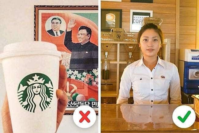 வடகொரியாவுக்குப் போனால் ஸ்டார்பக்ஸ் காபி கூடக் கிடைக்காது என்பதை விளக்கும் படம்தான் இடது பக்கத்தில் தரப்பட்டுள்ளது. காரணம் ஸ்டார் பக்ஸ் எனும் காபி கடைகள் இங்கு தடைசெய்யப்பட்டுள்ளது. உங்களுக்கு காபி குடிக்க வேண்டும் என்றால் பியாங்யாங்குக்குத் தான் போக வேண்டும். அங்குள்ள பிரபல காபி கடை : ரியொங்வாங் காஃபி ஷாப்