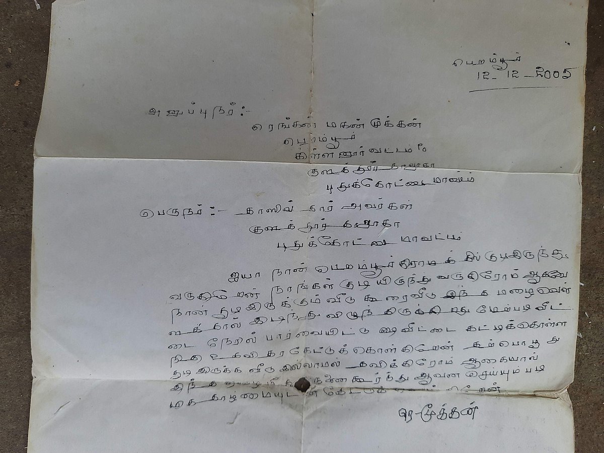 2005 இல் அழகான கையெழுத்தில் தனக்கு இடிந்து போன வீீட்டைக் கட்டிக் கொள்ள நிதி உதவி செய்ய வேண்டுமெனக் கேட்டு வட்டாட்சியருக்கு மனு அளித்திருக்கிறார். எந்த உதவியும் வந்துசேரவில்லை. அதனால் அவரது வாழ்க்கையில் எந்தத் தடையும் ஏற்படவில்லை.