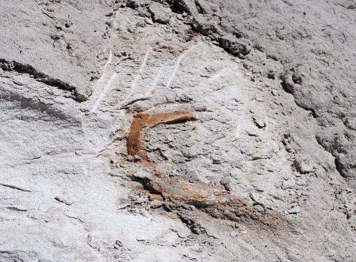 மணற்கல் சாய்வில் பகுதி மண்டையோடு, துளியூண்டு தாடை மற்றும் சில விலா எலும்புகள்