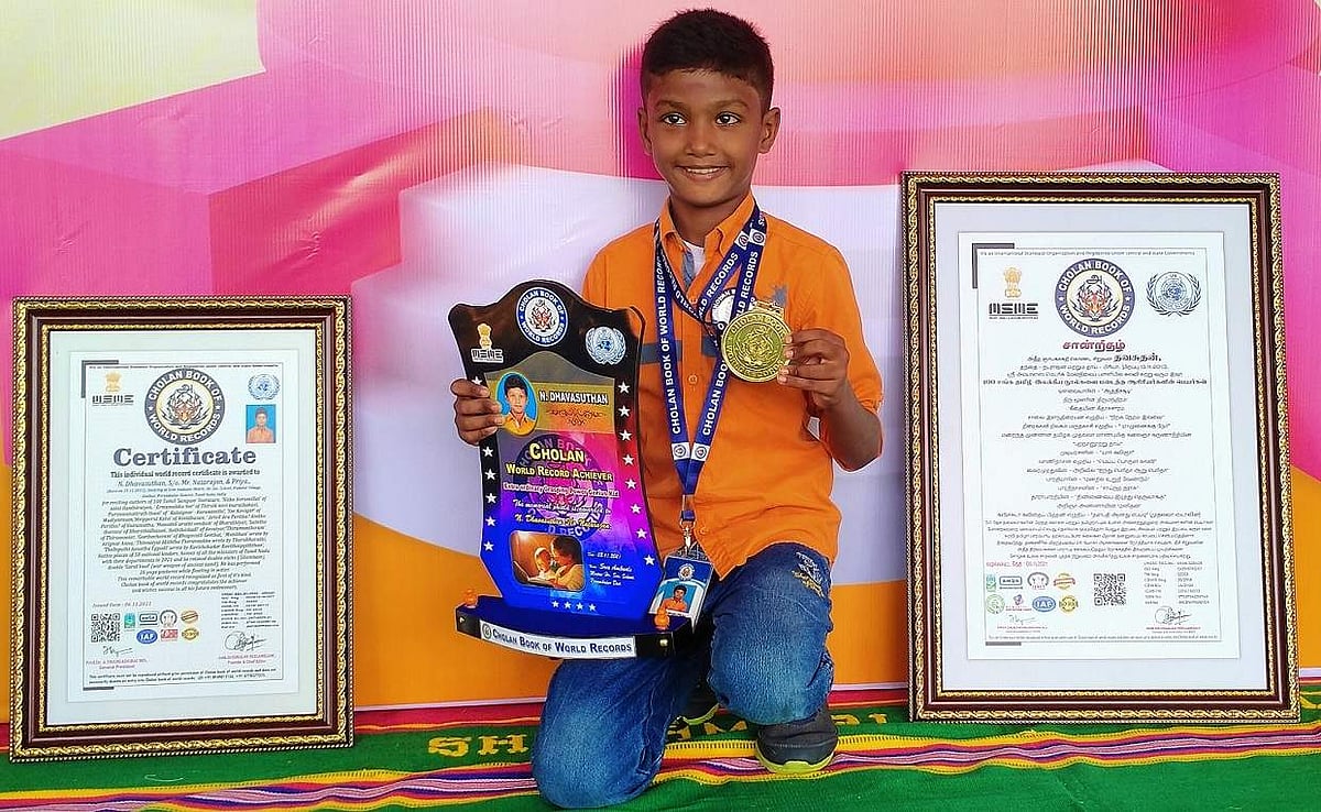 அந்த வகையில், பெரம்பலூர் மாவட்டம், ஆலத்தூர் வட்டம், பாடாலூர் கிராமத்தைச் சேர்ந்தவர் நடராஜன்-பிரியா தம்பதியினரின் மகன் தவசுதன் (7). அங்குள்ள அம்பாள் மெட்ரிக் பள்ளியில் 3 ஆம் வகுப்பு படித்து வரும் இவர், 100 சங்கத் தமிழ் இலக்கியத்தின் நூல் ஆசிரியர், சாலை இளந்திரையனின் நிற்க நேரமில்லை, மருதகாசியின் ஏர்முனைக்கு நேர், கலைஞர் கருணாநிதியின் புறநானூற்று தாய், முடியரசனின் யார் கவிஞர், வாணிதாசனின் யார் கவிஞர், வைரமுத்துவின் அறிவில் ஐந்து பெரியதா- ஆறு பெரியதா, பாரதியாரின் மனதில் உறுதி வேண்டும், அறிஞர் அண்ணாவின் மனிதன், தாராபாரதியின் திண்ணையை இடித்து தெருவாக்கு, கவிச்சுடர் கவிதைப் பித்தனின் தளபதி ஆனது எப்படி, பாரதிதாசனின் சாய்ந்த தராசு, ஔவையாரின் ஆத்திச்சூடி, திருமூலரின் திருமந்திரம், கீதாச்சாரம், 50 தேசத் தலைவர்களின் பெயர், வரலாறு, தமிழக அமைச்சர்களின் பெயர் ஆகியவற்றை குறிப்பிட்ட நேரத்தில் கூறுகிறார்.