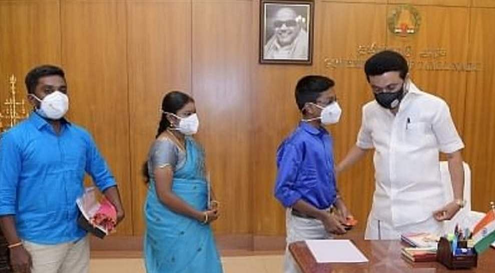 முதல்வர் மு.க.ஸ்டாலினிடம் பாராட்டு பெறும் மாதவ்.