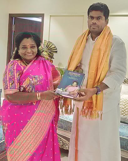 தன்னை சந்தித்த அண்ணாமலைக்குத் தான் எழுதிய நூலைப் பரிசளித்த தமிழிசை சௌந்தரராஜன்.