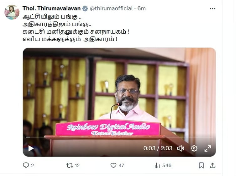 அடுத்து இதனை வலுப்படுத்தும் விதமாக தனது எக்ஸ் பக்கத்தில், 'ஆட்சியிலும் பங்கு; அதிகாரத்திலும் பங்கு!' என்ற தலைப்பில் பழைய விடியோவொன்றைப் பகிர்ந்தார் திருமாவளவன். இது அரசியலில் மேலும் சலசலப்பை ஏற்படுத்தியது. குறிப்பாகத் தமிழிசை சௌந்தராஜன் உள்ளிட்ட பாஜகவினர், திருமாவளவன் மற்றும் அவரது கட்சி குறித்து குறித்து பல்வேறு விமர்சனங்களை முன்வைத்தனர்.