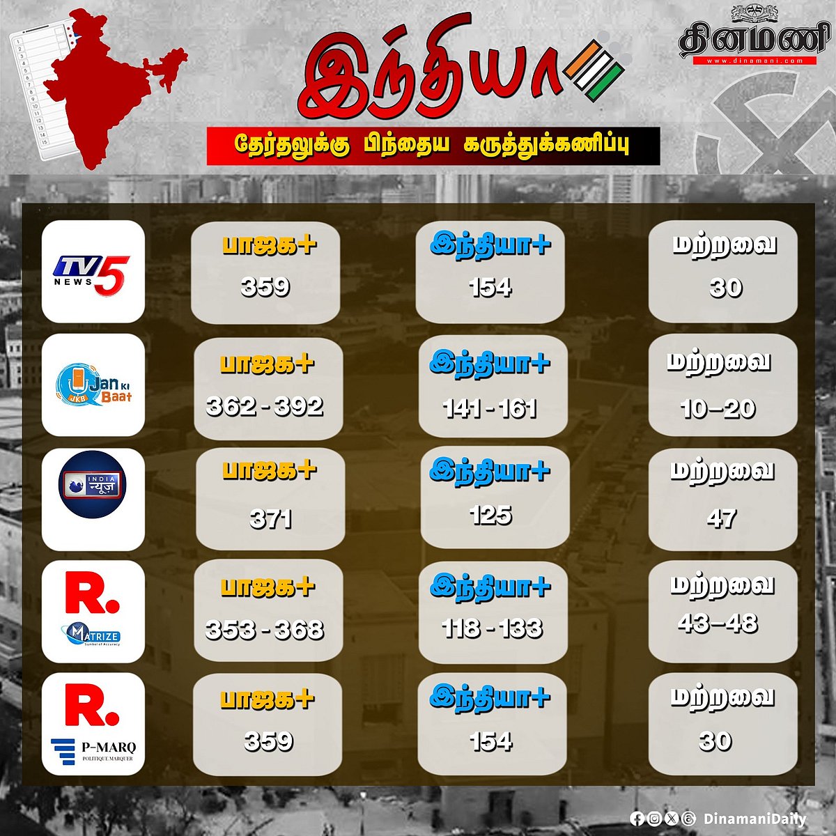 மக்களவைத் தேர்தலுக்கு முன்னதாக பாஜகவே வெல்லும் என்று கூறப்பட்டாலும், தேர்தல் பிரசாரத்தின்போது கள நிலவரத்தை கண்ட அரசியல் விமர்சகர்கள் ’இந்தியா’ கூட்டணியே ஆட்சியை பிடிக்கும் என்று தெரிவித்திருந்தனர். ஆனால், வாக்குப்பதிவுக்கு பிந்தைய கருத்துக்கணிப்பு முடிவுகள் பாஜக தலைமையிலான தேசிய ஜனநாயகக் கூட்டணிக்கு சாதகமாகவே அமைந்துள்ளது.