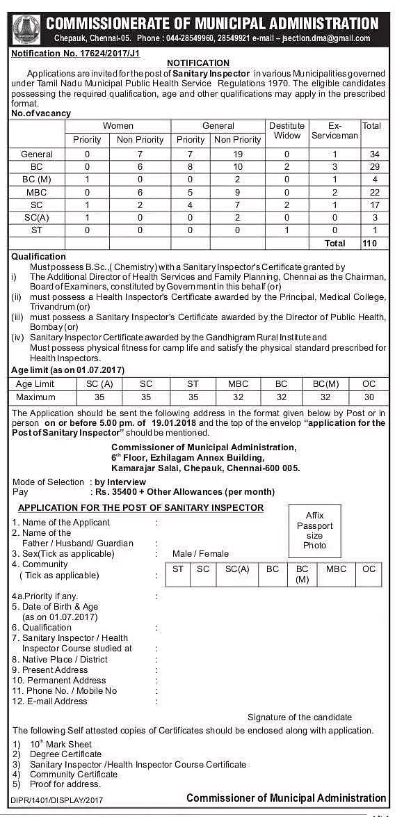 சென்னை நகராட்சியில் 2018-ஆம் ஆண்டிற்கான 110 சுகாதார ஆய்வாளர் பணியிடங்களுக்கான அறிவிப்பு வெளியிடப்பட்டுள்ளன. இதற்கு