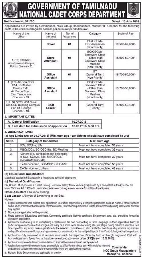 சென்னையில் உள்ள என்சிசி அலுவலகத்தில் காலியாக உள்ள ஸ்டோர் அட்டெண்ட், ஓட்டுநர், அலுவலக உதவியாளர் உள்ளிட்ட