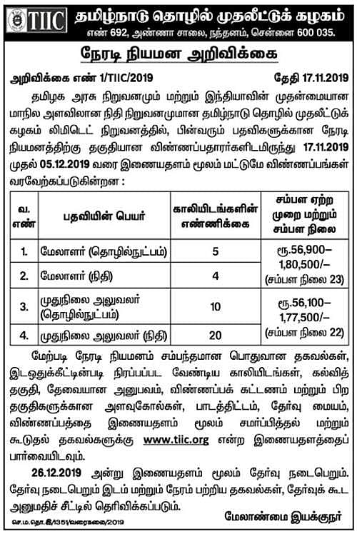 தமிழக அரசு நிறுவனமும் மற்றும் இந்தியாவின் முதன்மையான மாநில அளவிலான நிதி நிறுவனமுமான தமிழ்நாடு தொழில் முதலிட்டூக் கழகம் லிமிடெட் நிறுவனத்தில் நேரடி நியமனம் மூலம் நிரப்பப்பட உள்ள மேலாளர், முதுநிலை அலுவலர் பணியிடங்களுக்கான அறிவிப்பு வெளியிடப்பட்டுள்ளது. இதற்கு தகுதியானவர்களிடம் இருந்து டிசம்பர் 5 ஆம் தேதிக்குள் ஆன்லைனில் விண்ணப்பங்கள் வரவேற்கப்படுகின்றன.