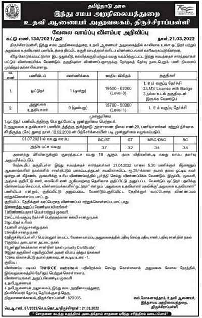 திருச்சிராப்பள்ளி, இந்து சமய அறநிலையத்துறை, உதவி ஆணையர் அலுவலகத்தில் காலியாக உள்ள ஓட்டுநர், அலுவலக உதவியாளர் பணியிடங்களை தற்காலிக அடிப்படையில் நிரப்புவதற்கான புதிய வேலைவாய்ப்பு அறிவிப்பு வெளியிடப்பட்