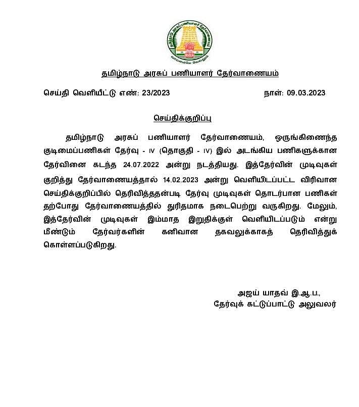 குரூப் 4 முடிவுகள் மார்ச் மாத இறுதிக்குள் வெளியிடப்படும் என டிஎன்பிஎஸ்சி அறிவித்துள்ளது.