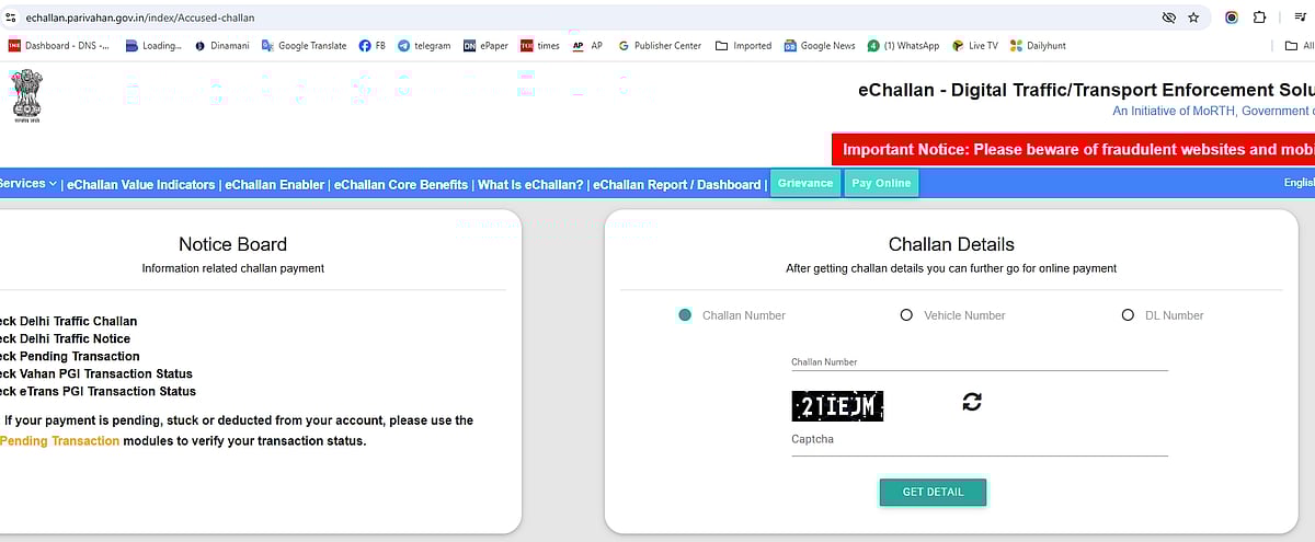 அதனை ஆன்லைனில் செலுத்த, கூகுளின் சென்று டிஎன் செலான் (TN chellan) என்று டைப் செய்து மாநில போக்குவரத்துத் துறையின் இணையதளத்துக்குச் செல்லலாம். இவ்வாறு செல்வதாக இருந்தால், அந்த இணையதளம் உண்மையான மாநில அரசின் இணையதளம்தானா என்பதை உறுதி செய்து கொள்ள வேண்டும். அல்லது நேரடியாக echallan.parivahan.gov.in என்ற இணையதளத்துக்குச் செல்ல வேண்டும்.