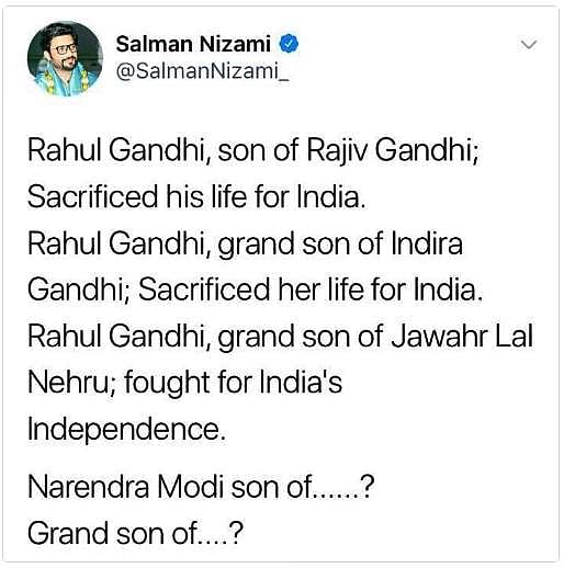 அச்சமயம் தனது ட்விட்டர் பக்கத்தில், ராகுல் அவர்களின் தந்தை ராஜீவ் இந்த தேசத்துக்காக உயிரிழந்தவர். பாட்டி இந்திராவும் தேசத்துக்காக உயிரிழந்தவர். பாட்டனார் ஜவஹர்லால் நேரு, இந்திய சுதந்திரத்துக்காக போராடியவர். ஆனால், நரேந்திர மோடியின் தந்தை யார், பாட்டனார் யார் என்று பதிவிட்டிருந்தார்.