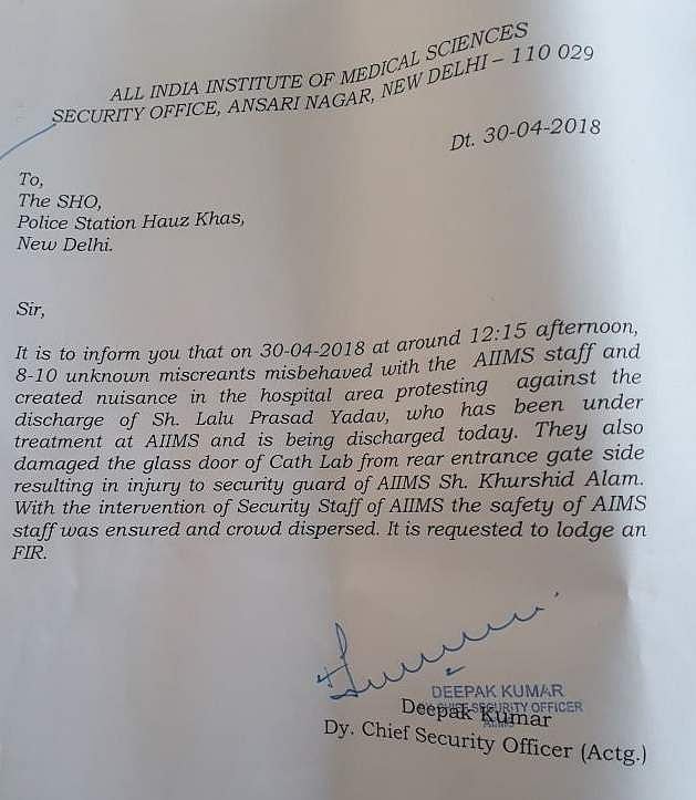 இந்நிலையில், தில்லி எய்ம்ஸ் மருத்துவமனையில் இருந்து லாலு பிராசத் யாதவ் மாற்றப்படும் போது அவர் அங்கிருந்த காவலர்களிடம் கடும் வாக்குவாதத்தில் ஈடுபட்டார். மேலும் எய்ம்ஸ் மருத்துவமனை நிர்வாகிகள் சிலர் மர்ம நபர்களால் தாக்கப்பட்டனர். இதுதொடர்பாக தில்லி எய்ம்ஸ் மருத்துவமனை அறிக்கை வெளியிட்டுள்ளது. அதில், லாலு பிரசாத் யாதவ் டிஸ்சார்ஜ் செய்யப்படும் போது மர்ம நபர்கள் எங்கள் நிர்வாகிகளை தாக்கியுள்ளனர். எனவே அவர்கள் மீது நடவடிக்கை எடுக்க வலியுறுத்தி தில்லி காவல்துறையில் புகார் அளித்துள்ளோம் என்றிருந்தது.