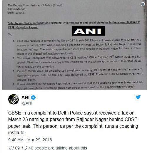 இந்த நிலையில், வினாத்தாள் கசிந்தது தொடர்பாக தில்லி காவல்நிலையத்தில் சிபிஎஸ்இ அளித்த புகார் மனுவில் கூறப்பட்டிருப்பதாவது, ராஜிந்தர் நகரில் இயங்கும் பயிற்சி மையத்தை நடத்தும் நபருக்கு, வினாத்தாள்கள் கசிந்ததில் முக்கியப் பங்கு இருப்பதாக, மார்ச் 23ம் தேதி அலுவலகத்துக்கு பெயர் குறிப்பிடாமல் அனுப்பப்பட்ட பேக்ஸில் தெரிவிக்கப்பட்டிருந்தது. அந்த பேக்ஸில் ராஜிந்தர் நகர் பகுதியில் இயங்கும் இரண்டு பள்ளிகளுக்கும் வினாத்தாள் கசிந்ததில் தொடர்பிருப்பதாகவும் கூறப்பட்டிருந்ததாக புகாரில் தெரிவிக்கப்பட்டுள்ளது.