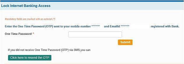 7. அதன் பிறகு உங்களுக்கு ஒன்டைம் பாஸ்வேர்ட் வரும், அதுவும் உங்கள் செல்போன் எண் அல்லது மின்னஞ்சல் முகவரிக்கு வரும். அதனை பதிவு செய்து உங்கள் வங்கிக் கணக்கை லாக் செய்து கொள்ளலாம்.