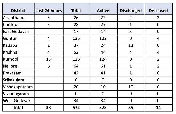 ஆந்திரத்தில் புதிதாக 38 பேருக்கு கரோனா: மொத்த பாதிப்பு 572 ஆனது