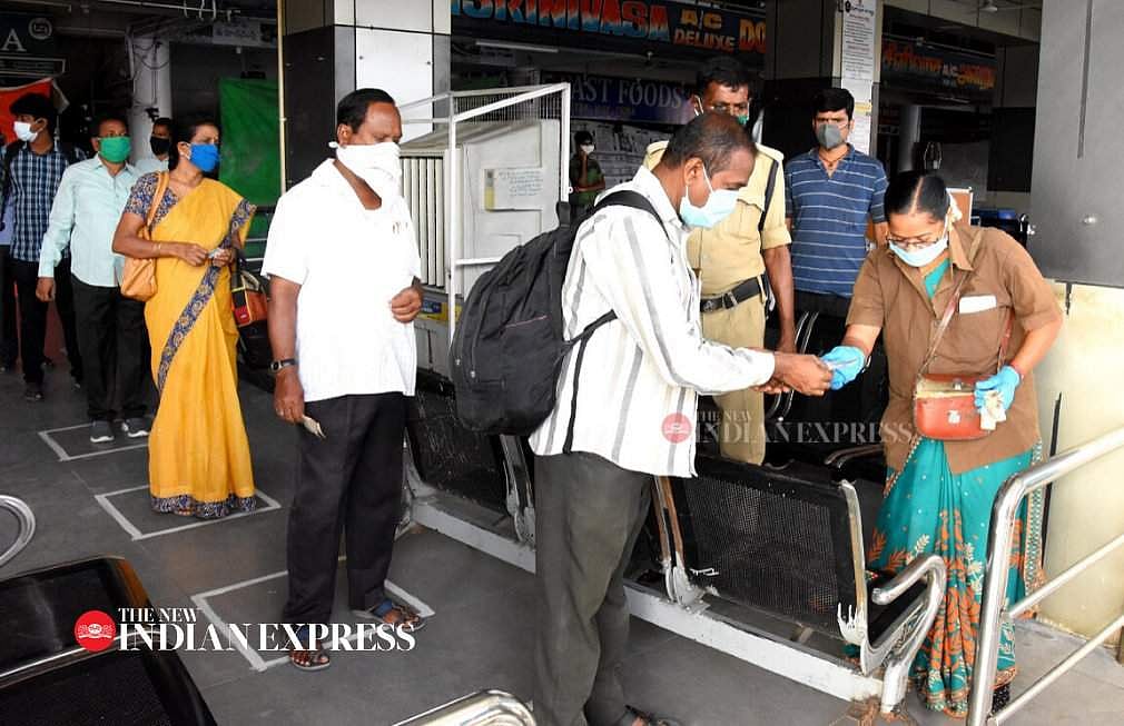 கரோனா பாதிப்பு அதிகம் உள்ள பகுதிகளைத் தவிர்த்து பிற பகுதிகளில் இன்று காலை முதல் பேருந்துசேவைகள் தொடங்கின. சமூக இடைவெளியைப் பின்பற்றி பயணிகள் பேருந்துக்குள் அனுமதிக்கப்பட்டனர்.
