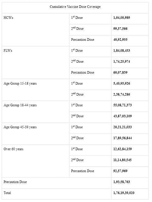நாட்டில் இதுவரை செலுத்தப்பட்ட கரோனா தடுப்பூசிகளின் எண்ணிக்கை 176.19 கோடியைக் கடந்துள்ளதாக மத்திய சுகாதாரத்துறை புதன்கிழமை தெரிவித்துள்ளது.